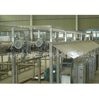 這是一種性能卓越,設(shè)計先進(jìn)、新穎的流態(tài)化速凍裝置,是我公司在多年生產(chǎn)流態(tài)化速凍裝置的基礎(chǔ)上,結(jié)合國內(nèi)外同類生產(chǎn)廠家的優(yōu)點研制生產(chǎn)的,產(chǎn)品在凍結(jié)過程中真正做到了全浮狀態(tài),在使用中獲得客戶的普遍好評。 2、工作特點:1)、凍結(jié)效率高,凍結(jié)產(chǎn)品種類多;2)、實現(xiàn)食品的連續(xù)單體速凍;3)、采用機(jī)械風(fēng)冷裝置,能耗低;4)、采用高壓風(fēng)機(jī)、網(wǎng)帶采用變頻調(diào)節(jié)和時間指示器,實現(xiàn)精確加工;5)、采用連續(xù)清洗、干燥裝置,清潔衛(wèi)生;6)、在-32蒸發(fā)溫度下即可實現(xiàn)快速凍結(jié);7)、凍結(jié)產(chǎn)品種類繁多,除適用于果蔬類食品連續(xù)凍結(jié)外,不增添設(shè)施和改變裝置的情況下,還可適用于海產(chǎn)品,如扇貝丁、蝦仁、魚片等連續(xù)快速凍結(jié);8)、沖霜間隔時間長,保證生產(chǎn)的連續(xù)性。 3、技術(shù)說明:1)、產(chǎn)品在制冷系統(tǒng)蒸發(fā)溫度為-32即可實現(xiàn)快速凍結(jié),此時出料溫度 為-18,節(jié)省能源,充分利用冷量; 2)、網(wǎng)帶可以調(diào)速,以適應(yīng)于多種食品的凍結(jié);3)、最佳的速度組合,保證各類食品的速凍要求;4)、離心風(fēng)機(jī):該系統(tǒng)采用高壓離心風(fēng)機(jī),很大的靜壓范圍內(nèi)產(chǎn)生相應(yīng)的風(fēng)力,保證形成流化床,同時延長沖霜間隔時間;5)、庫體采用δ120mm的雙面不銹鋼夾聚胺脂發(fā)泡夾芯板,門鎖為德國進(jìn)口,保溫效果顯著,外形美觀大方,為國內(nèi)速凍機(jī)最佳庫板;6)、輸送網(wǎng)帶采用不銹鋼網(wǎng)帶傳送,所有與食品接觸部分均為不銹鋼;7)、電控箱:單獨的控制盤能進(jìn)行獨立的電啟動和控制網(wǎng)帶傳送速度的操作。 4、特征優(yōu)點:1)、網(wǎng)帶為變頻調(diào)速:在最佳條件下凍結(jié)各種食品,食品無損傷,食品不粘結(jié)。2)、冷風(fēng)機(jī):采用鋁管鋁整套片,進(jìn)風(fēng)側(cè)片距大,長時間工作不結(jié)霜; 3)、高壓風(fēng)機(jī):保證連續(xù)生產(chǎn),延長沖霜間隔時間;4)、標(biāo)準(zhǔn)保溫絕熱板:組裝快,結(jié)合緊密,不逃冷;5)、蒸發(fā)溫度采用-32,與蒸發(fā)溫度為-40相比,系統(tǒng)節(jié)能25%左右;6)、綜合電控箱:可以控制網(wǎng)帶走速,控制生產(chǎn)時間,顯示轉(zhuǎn)速與庫內(nèi)溫度;7)、根據(jù)客戶需要,可設(shè)計安裝小車道凍結(jié),以增加產(chǎn)量及品種。